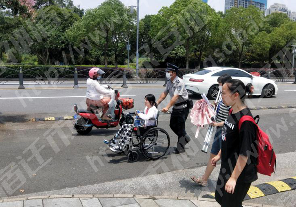 7月7日11點30分,昆山市保安服務(wù)有限公司駐昆山市一中考點保安員盛培剛執(zhí)勤發(fā)現(xiàn),一名考生考試結(jié)束后拄著拐杖走路困難,即取來應(yīng)急輪椅,推行送上返程大巴。
