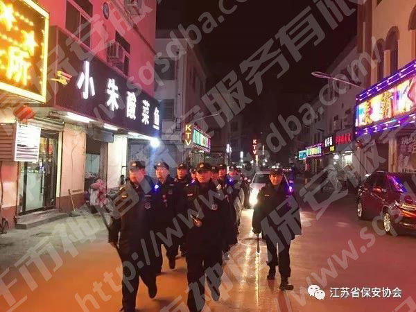 沭陽縣保安服務(wù)公司在轄區(qū)公安機(jī)關(guān)組織下,針對(duì)治安復(fù)雜區(qū)域開展夜間巡邏。