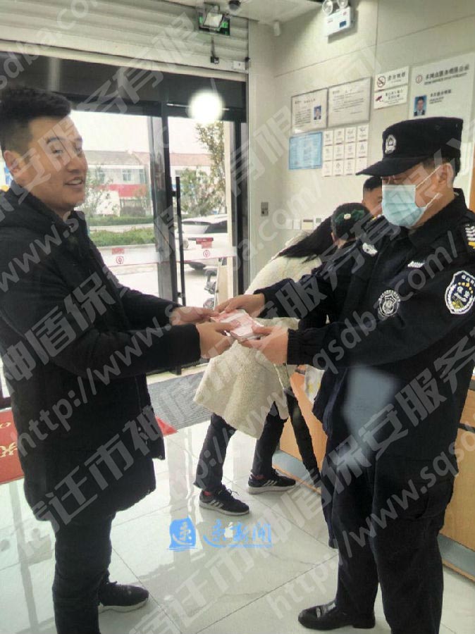 發(fā)布時(shí)間:2020-11-27 | 來(lái)源:宿遷市神盾保安服務(wù)有限公司 | 閱讀:1402次(速新聞?dòng)浾?/span> 孫軍賢 通訊員 李霄 )如果在路邊撿到萬(wàn)元現(xiàn)金,你會(huì)怎么做?11月26日上午,記者從宿遷市神盾保安服務(wù)有限公司獲悉,該公司保安劉秀林在路邊撿到2萬(wàn)元現(xiàn)金后,沒(méi)有絲毫遲疑便將現(xiàn)金交到銀行,后查找核實(shí)后及時(shí)歸還失主。