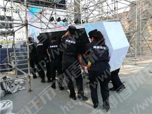 神盾保安隊員在金秋百萬游客游宿遷暨三臺山衲田花海音樂季啟動儀式現(xiàn)場維護秩序。